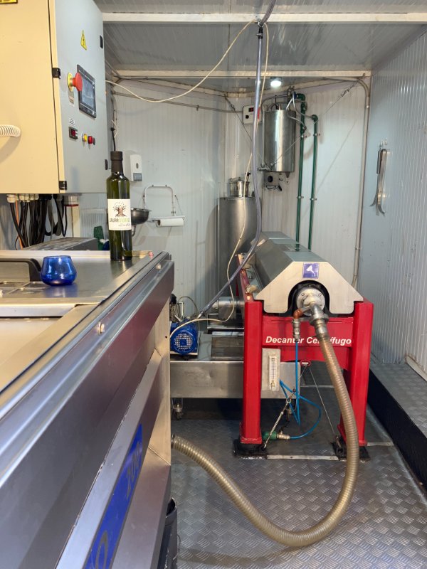 Transferimos a massa para o decantador centrífugo, que separa o Extra Virgem do alperujo.